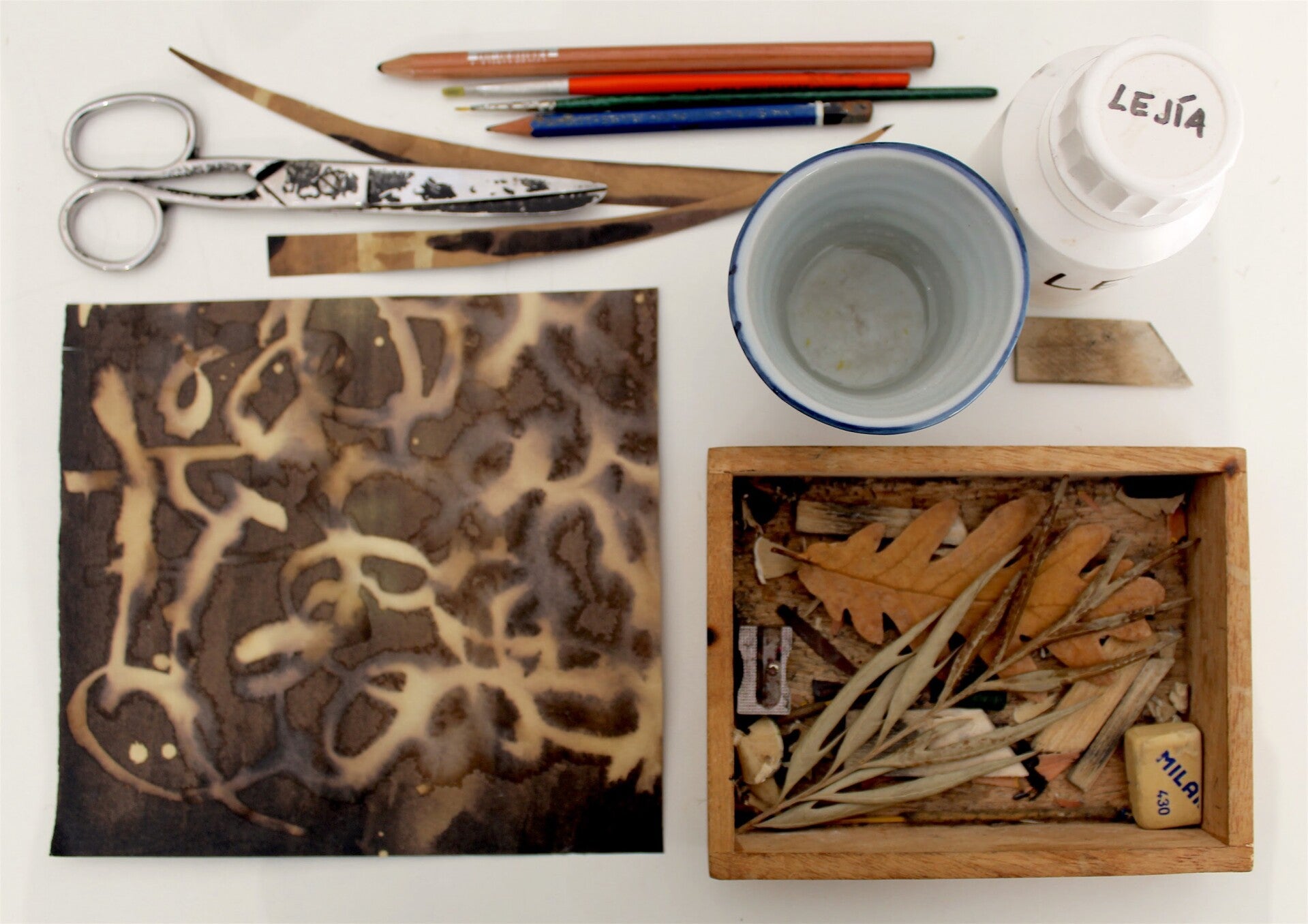 Cada una de mis obras está creada mediante un proceso de decoloración de papel oscuro utilizando lejía (cloro/lavandina) y agua. En algunas piezas podrás apreciar los colores naturales de flores y hojas secas, pero jamás empleo pintura.