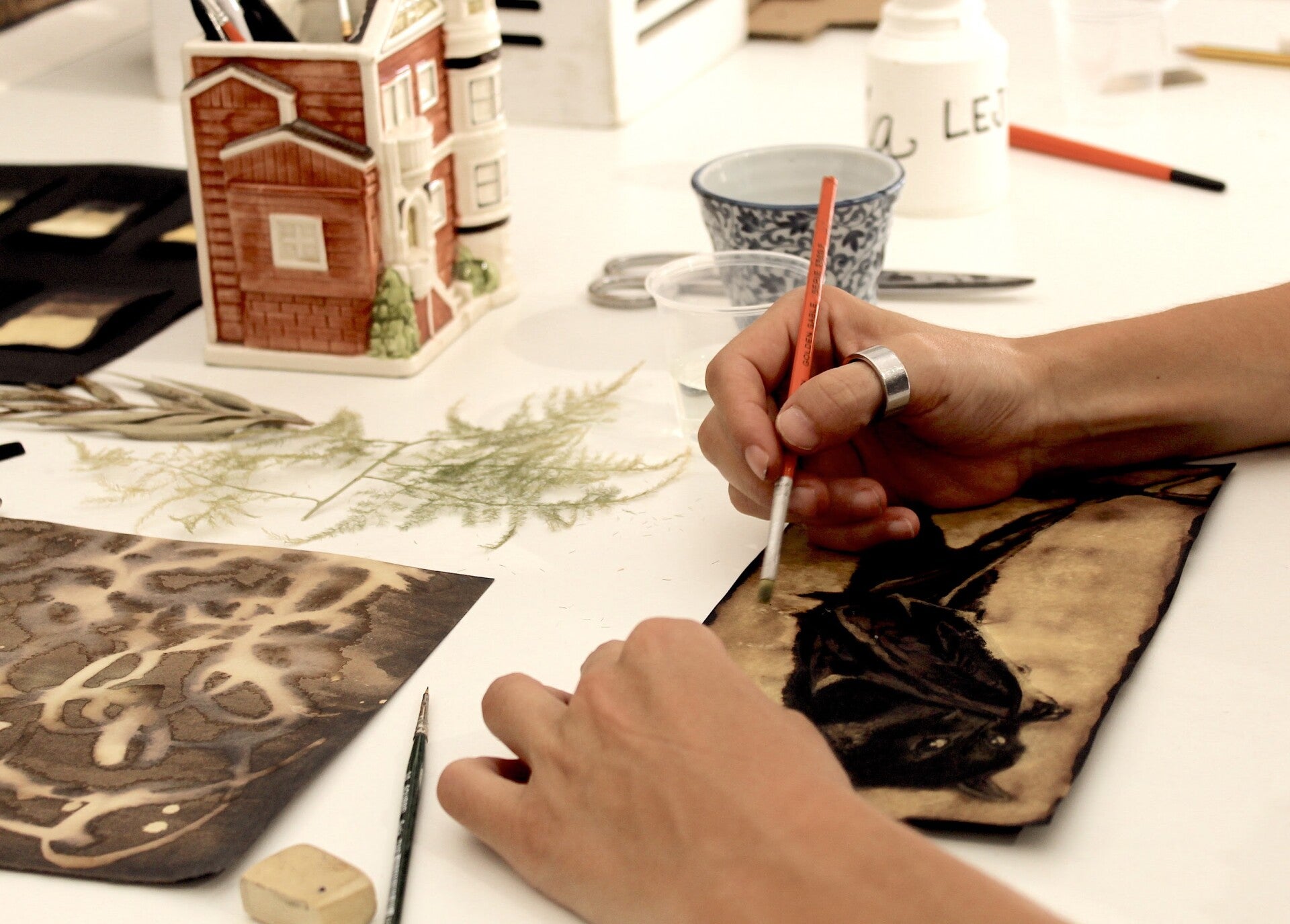 Apenas he encontrado artistas que se dediquen a lo mismo que yo. Con esta soledad el proceso de exploración sigue siendo arduo. La ausencia de referencias provoca que me estanque y reactive sin más control que el de mi voluntad. Es difícil progresar con una técnica tan simple y desconocida y nunca poder encontrar el papel que compré anteriormente. Las fórmulas que utilizan los fabricantes para tintar el papel varían en cada paquete de producción. Mis obras son únicas porque son el resultado de una circunstancia y un material irrepetibles.